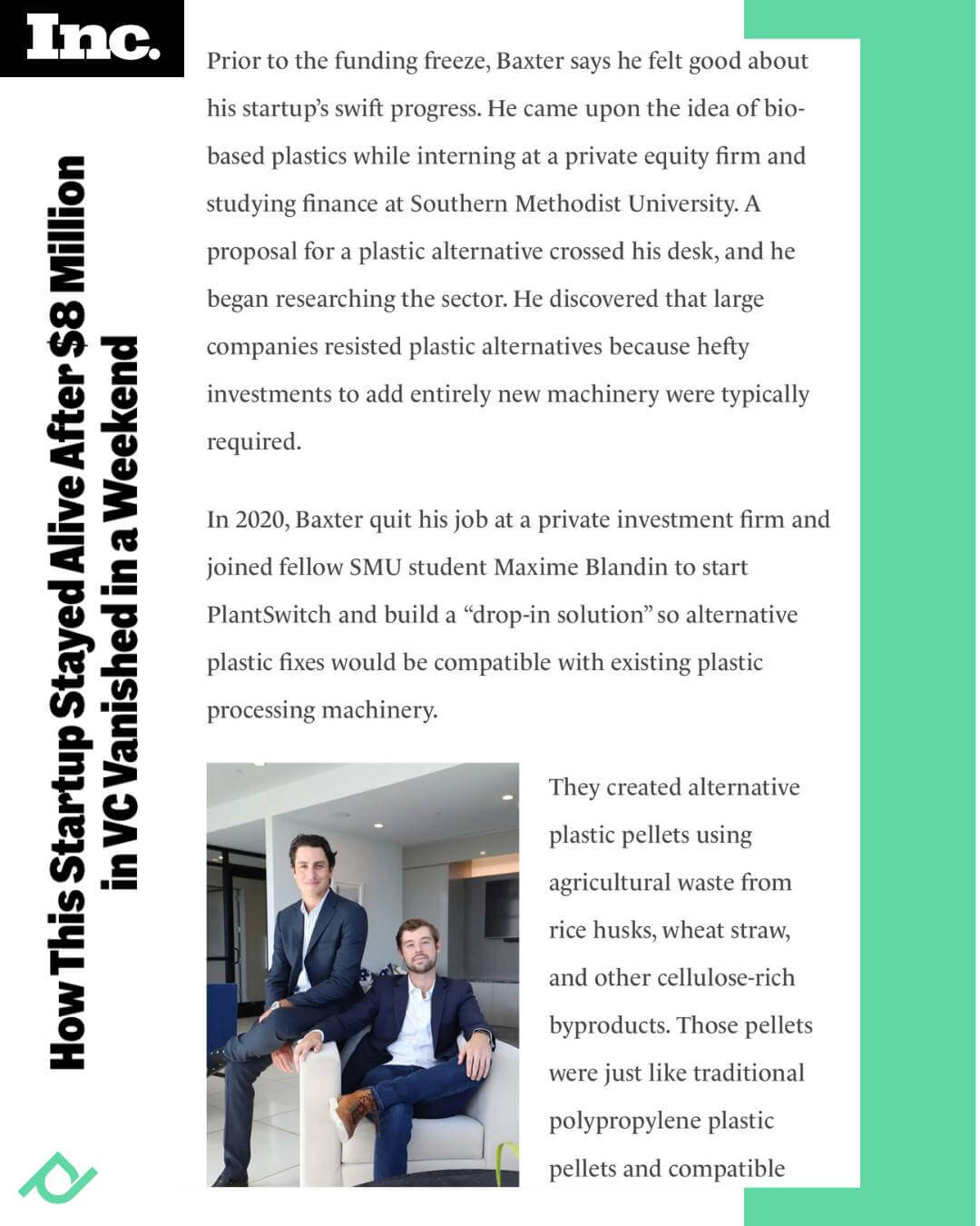 In a world grappling with plastic pollution and the urgent need for sustainable alternatives, Dallas-based PlantSwitch stands out as a beacon of innovation and impact. Founded by Forbes 30 Under 30 honorees Dillon Baxter and Maxime Blandin, PlantSwitch is not just another startup—it’s a fast-growing force leading the plant-based plastic revolution, and a true asset to the city of Dallas.